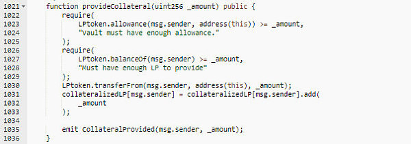 然后,將所獲的LP代幣抵押在Warp Finance合約中,交易及代碼如下圖:
