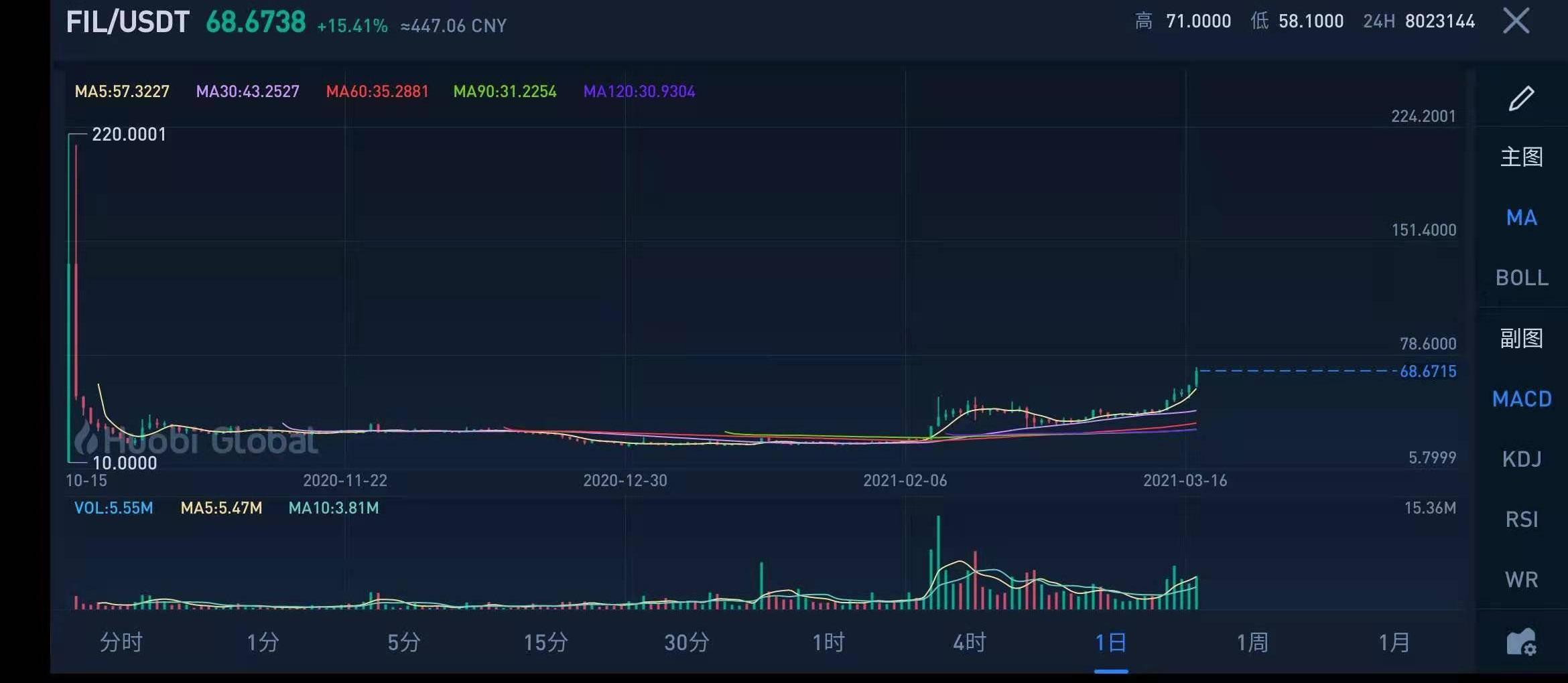 更多數據顯示,過去一周FIL漲幅接近30%,過去一個月漲幅8%。如果僅參考火幣交易所價格,那么FIL從低點21刀大概翻了3倍。但距離歷史高點220刀已經有不小差距。