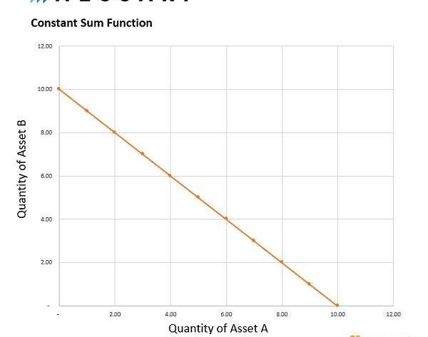 解決價格滑點問題的一個方法是,使用常數和函數作為AMM的內部交易機制。當使用兩種資產進行操作時,恒和做市商強制規定資產數量之和必須保持不變,并遵循以下函數: