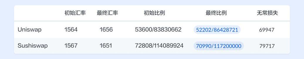 表1:Uniswap和Sushiswap的無常損失計算/美元