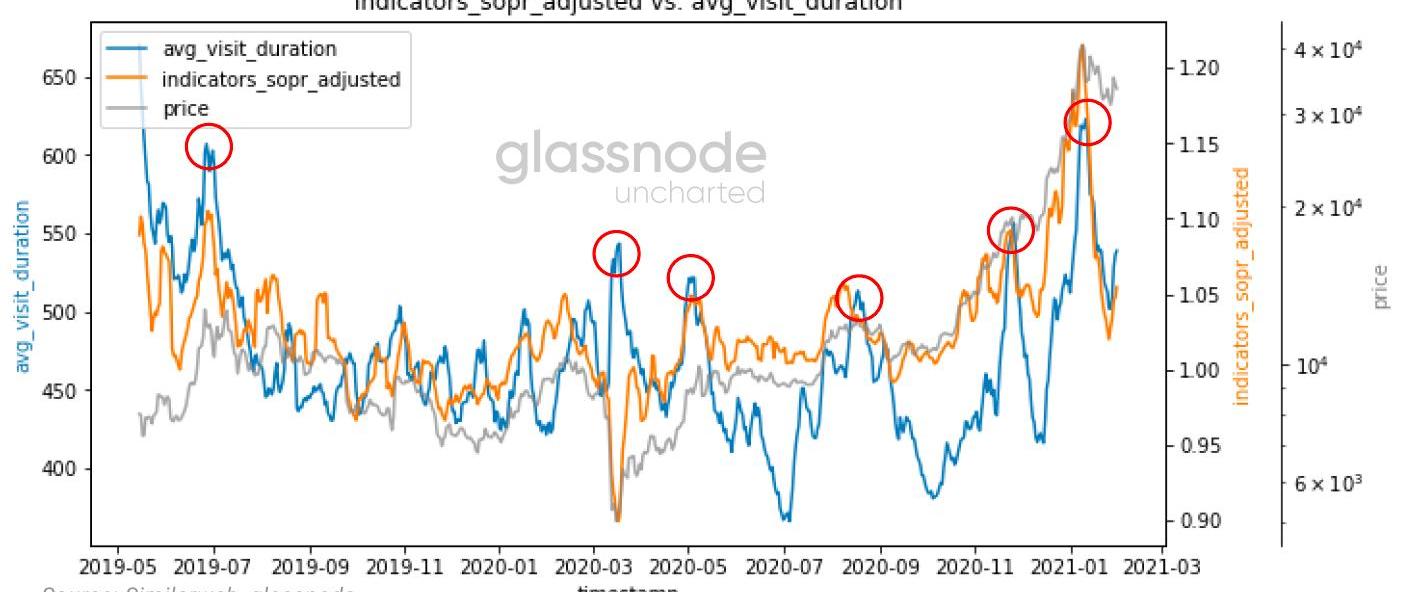 有趣的是,在關鍵價格水平期間,各交易所的平均登錄時間持續時間也急劇增加。由“調整后的SOPR”表示的許多獲利區域似乎與平均交易時間延長的區域保持一致。