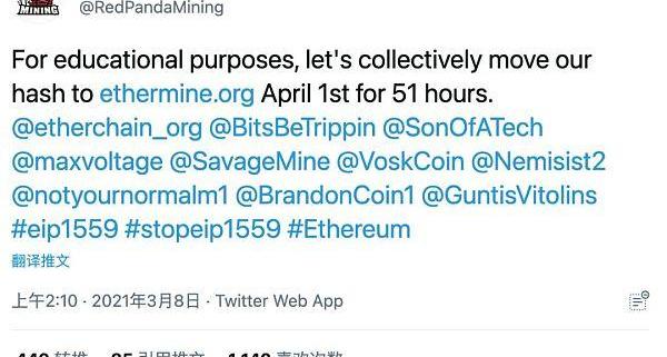 目前很多以太坊礦池對EIP-1559持反對態度。推特用戶@RedPandaMining在3月8日發推文號召以太礦工在4月1日舉行51小時的算力展示,將算力轉移到反對1559的礦池Ethermine去。當然顯然也是在向外界表明,這些反對礦工算力或有可能超過當前以太坊網絡算力的51%。