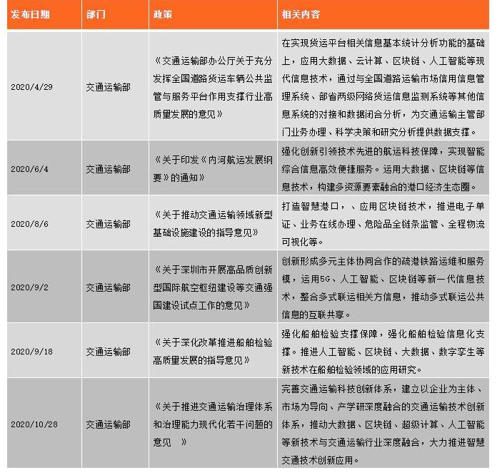 交通運輸部獨立發布以及聯合發布的相關政策共有10部,其中6部獨立發布政策涉及道路貨運交通公共監管與服務、智慧港口、船舶檢驗、智慧交通等內容。
