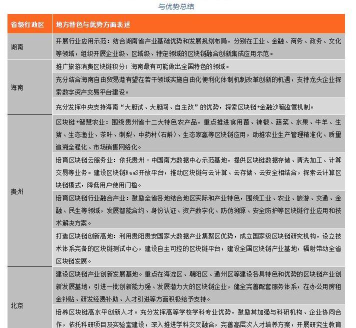 其中,海南、貴州、北京等省市都提出要結合自身發展戰略,將區塊鏈與地方產業優勢相結合,打造區塊鏈與特色產業雙贏局面。