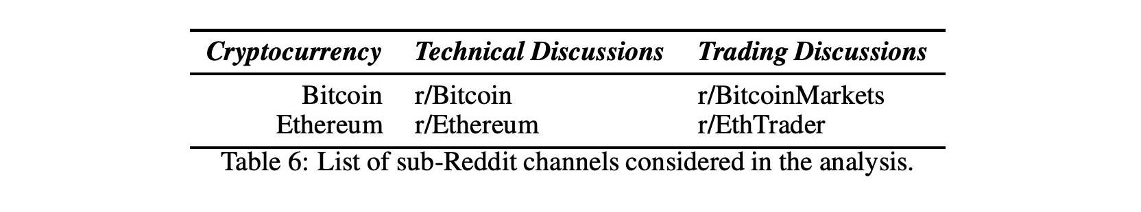 本節描述了社交媒體指標的時間序列是如何分別從以太坊和比特幣開發者對Github的評論和用戶對Reddit的評論構建的。特別是,對于Reddit,我們考慮了表6中列出的四個子Reddit通道。考慮的時間段為2017年1月至2021年1月。
