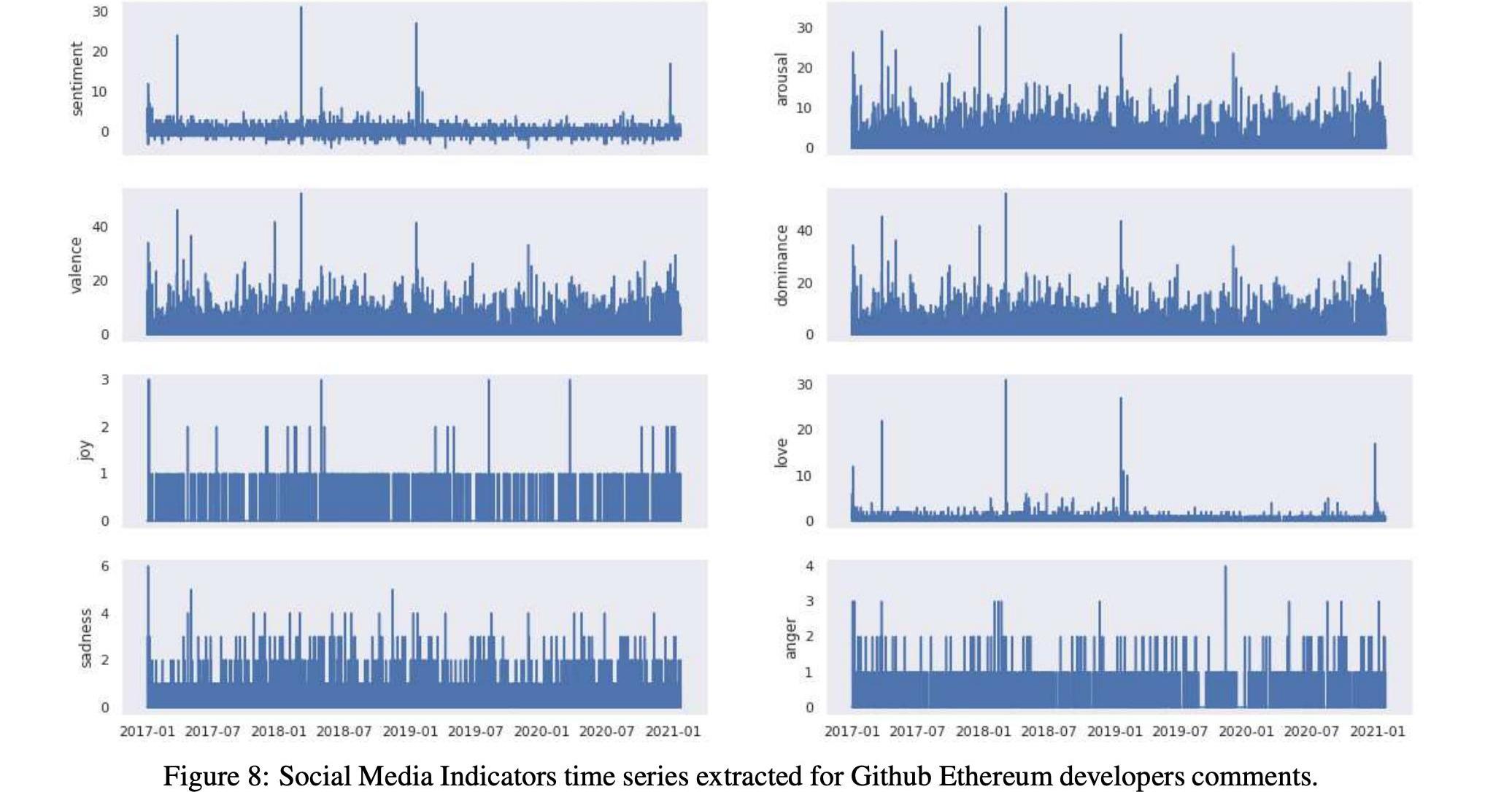 從GithubforEthereum中提取的開發人員注釋和從Redditr/Ethereum中提取的用戶注釋的示例可以在表7和表8中看到。如本例所述,與評論相關的情緒的定量度量是使用最先進的文本分析工具計算的。為每條評論計算的這些社交媒體指標是情感,如愛、快樂、憤怒、悲傷、VAD、支配、喚醒)和情感。