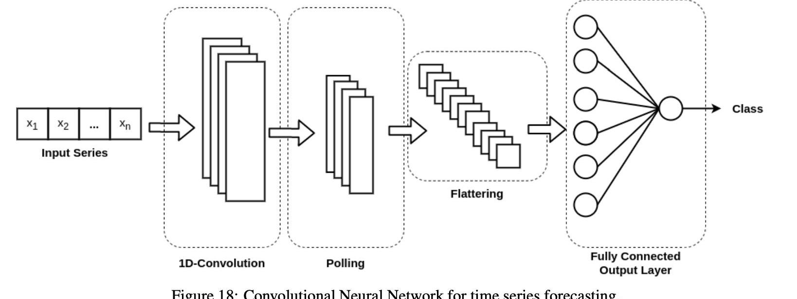 卷積神經網絡具有與傳統神經網絡相似的結構,包括輸入輸出層和多個隱層。CNN的主要特征是其隱藏層通常由執行上述操作的卷積層組成。圖18描述了用于時間序列分析的CNNs的一般架構。我們使用一個一維卷積層,而不是通常的二維卷積層典型的圖像處理任務。然后用輪詢層對第一層進行歸一化,然后將其展平,以便輸出層可以在每個步驟t處處理整個時間序列。在這種情況下,許多一維卷積層可以組合在深度學習網絡中。
