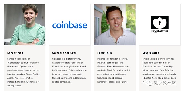 有Coinbase,還有Peter Thiel(Paypal聯合創始人)還有Sam Altman(YCcombinator)也是創投界的大佬。