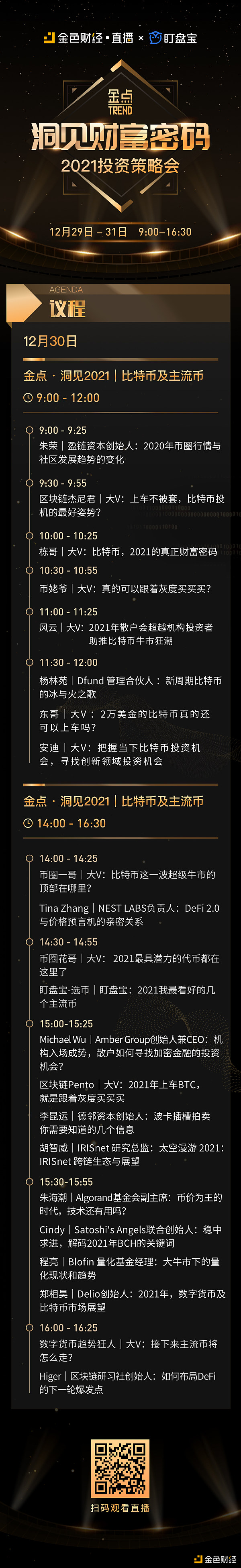在這百年未有之大變局的2020年,我們平安度過了!加油!中國!2020 年關之際,金色財經年度巨獻之《洞見財富密碼2021投資策略會》,聚焦5類+ 價值板塊,站在8位+ 行業預見者肩膀,圍觀20場+ 直播經驗分享,遇見21位+ 敏銳社區KOL,群聊66位+ 百萬身價交易員,洞見2021年數字貨幣領域財富密碼!