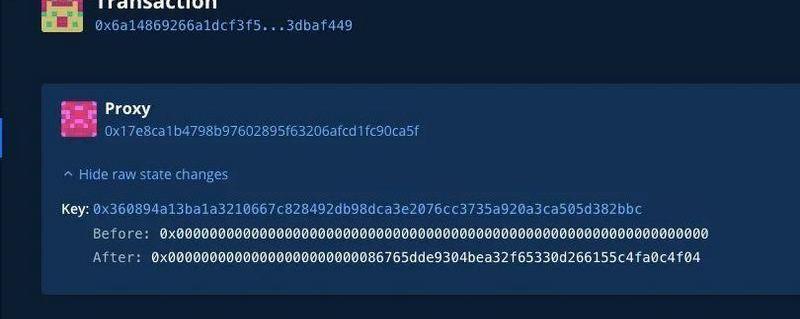 可以看到,交易中改變了存儲位置為0x360894a13ba1a3210667c828492db98dca3e2076cc3735a920a3ca505d382bbc的內容,而寫入的內容正是攻擊者自己的惡意合約地址?0x86765dde9304bea32f65330d266155c4fa0c4f04。