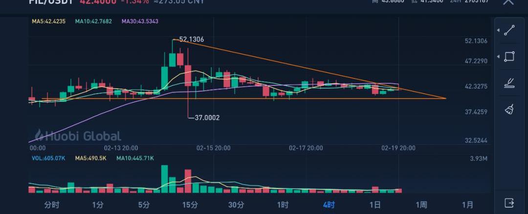 然后FIL的看漲勢頭就減少了,并且由于暴漲引起了投資者的拋售,FIL的價格一直處于小幅波動中,并形成了一個下降的三角形模式。