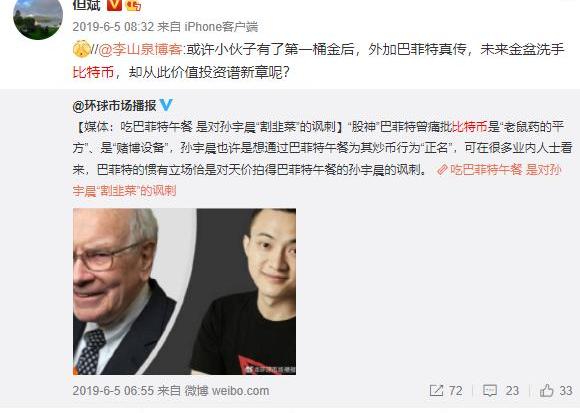 備注:2018年至2019年,但斌在微博的比特幣發文非常少,主要是轉發,內容大都是比特幣價格大跌。這條孫宇晨和巴菲特吃晚餐內容相關的推文,他轉了兩次。