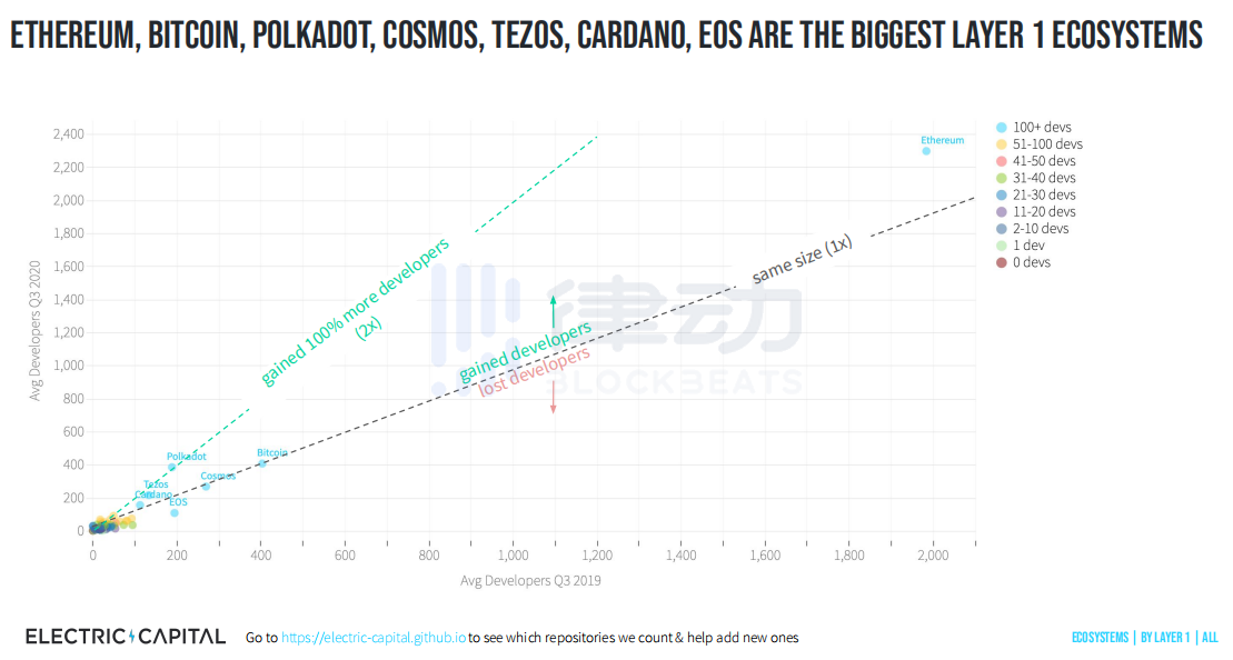 2. Polkadot、Tezos、Cardano 在 2019 年第三季度擁有超過 100 個開發者,并在 2020 年第三季度吸引了更多開發者。