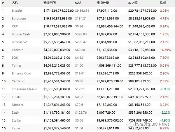 加密貨幣市值排名第1的Bitcoin據比推行情,當前價格為9562.36美元,總市值1712.34億美元,24小時內上漲2.05%。最高價格為9569.7美元,最低價格為9234.31美元。