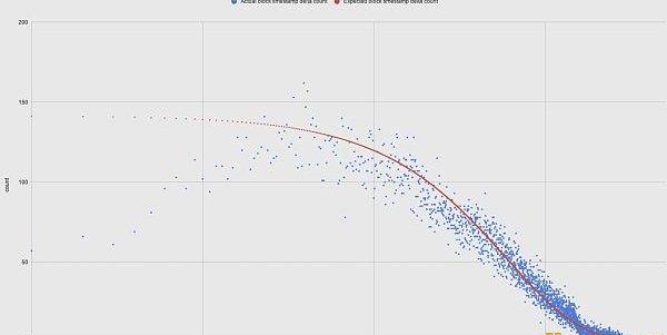 如果將670000個區塊的數據全部繪制成一張圖表會是怎么樣的呢?根據下圖,實際出塊時間與預期是非常吻合的,除了圖中左邊的部分。