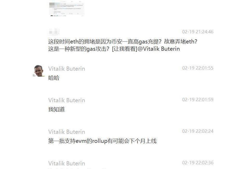 實際上類似的推測已經在推特、微信等社交媒體大量談及。2月19日晚,一系列微信群聊記錄流傳出來,內容顯示有用戶@Vitalik并詢問這段時間eth的擁堵時不時因為幣安一直高gas充提,Vitalik則回復稱“哈哈,我知道,第一批支持evm的rollup有可能會下個月上線,這個會降低交易費100倍。”