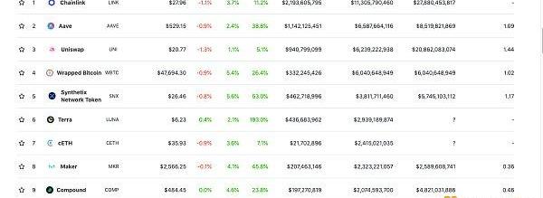 1.YFI突破45000美元關口日內漲幅為31.69%