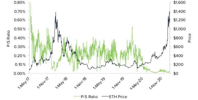 交易費用是在以太坊網絡上支付的交易總額。考慮ETH價值的另一種方法是將ETH的歷史價格與網絡上的銷售進行比較。下圖以“價格與銷售額”比率說明了這種關系:比率越低,表明該網絡相對于ETH的歷史市值產生較高的收入。