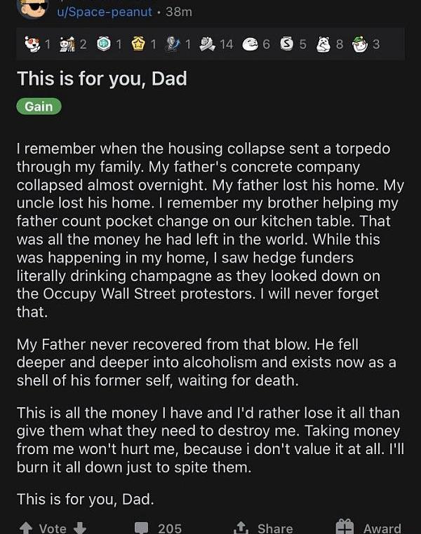 他們的年齡還不足以在這段時間內遭受經濟損失,但他們肯定感受到了危機對他們家庭的影響,這對他們來說是個人的。這是對華爾街在崩盤前和崩盤期間因貪婪和欺詐行為給普通人帶來的痛苦和折磨的報復。他們厭倦了雙重標準,不同的規則基于你的金融財富和常見的做法私人化的收益和社會化的損失。現在很明顯,主要目標是給對沖基金帶來痛苦,并且在這個過程中不計后果地投入自己的資金。