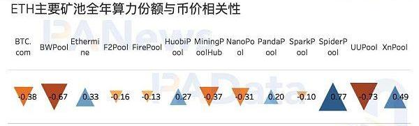 在以太坊礦池中,SpiderPool是唯一一個算力與區塊產量高度正相關的礦池,皮爾森系數大約為0.77,這意味著SpiderPool的算力份額增長時恰逢ETH幣價也在增長。相反,UUPool和BWPool的算力與區塊產量則呈高度負相關,皮爾森系數在-0.7左右。