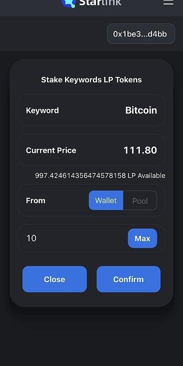 登錄https://pool.starlink.so,選擇對應礦池進行抵押挖礦,StarLink支持SLN/HUSD、BTC/USDT等LP抵押,同時也支持HBTC,HETH,HUSD單幣抵押,其中SLN/HUSD幣對LP挖礦可獲得30x收益。