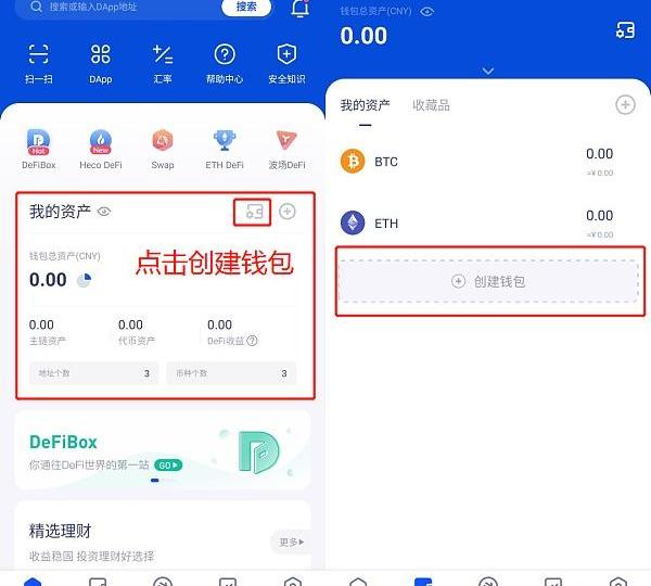 第二步:打開火幣錢包,在首頁中間會出現“創建”按鈕,勾選HECO,點擊創建錢包