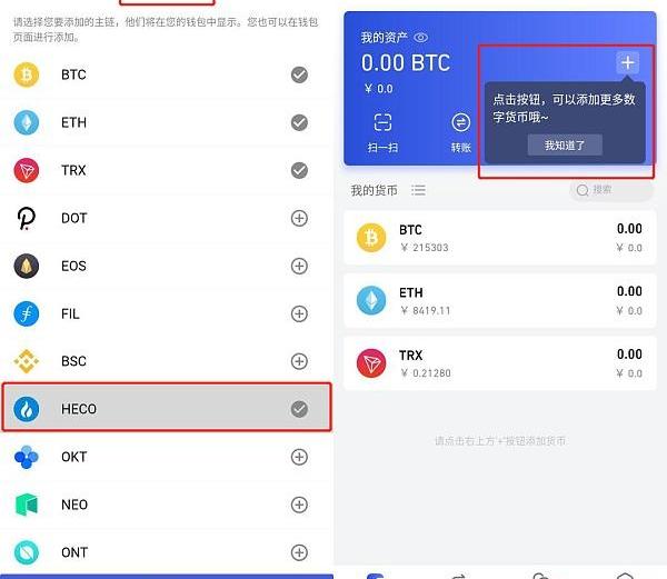 第四步:創建錢包或者導入錢包后,在選擇主鏈界面,添加Heco,進入首頁后,請在“我的資產”界面點擊”+“這個符號。