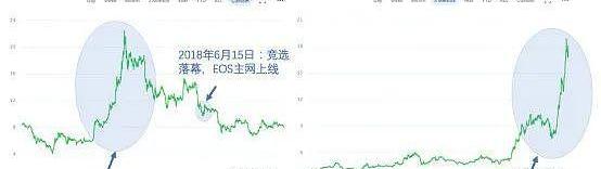 如下圖所示,現在的波卡和2018年年初的EOS相比,K線走位非常類似。就像EOS超級節點需要鎖倉EOS一樣,平行鏈插槽競拍需要質押DOT,因此我們可以將拍賣開啟前的1-2個月看作是“質押行情”。根據PolkaWorld的預測,Kusama插槽的競拍大概在今年3月,而波卡插槽的競拍可能在4月左右,那么現在DOT的拉漲很明顯是事件驅動的,這之后的走勢會如何,看看18年6月EOS主網上線之后,EOS的價格走勢,或許是一個參考。當然如上段所說,牛熊情勢不同,波卡要幸運得多。