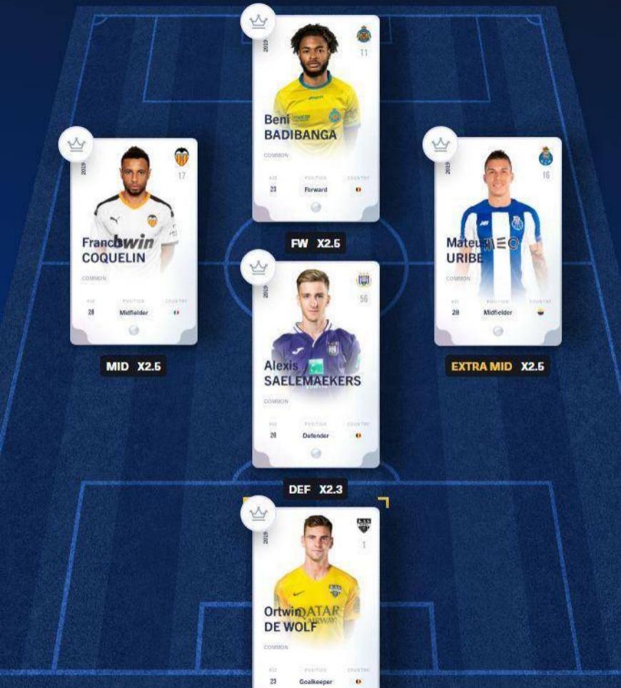 Sorare是一個玩法相當簡單的放置類足球游戲。玩家第一次注冊Sorare會直接得到10?張普通卡,可憑此創建第一支隊伍。游戲界面有五個卡槽,分別對應中場、前鋒、后衛、門將和替補。根據規則,玩家可以選擇5張球員卡作為起始卡組。把特定位置的球員卡放到相應的卡槽后,玩家無需再做任何操作,只要安心等待比賽結果即可,而所謂的比賽結果與玩家卡組里的5位球員在真實比賽中取得的個人成績密切相關。
