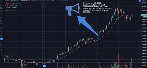 2020年12月16日,GuggenheimPartner的首席投資官ScottMinerd向彭博社公開表示,比特幣應該價值40萬美元。在發言時,比特幣的交易價格約為22000美元。巧合的是,比特幣的價格很快就飆升,最高達到約4.2萬美元。