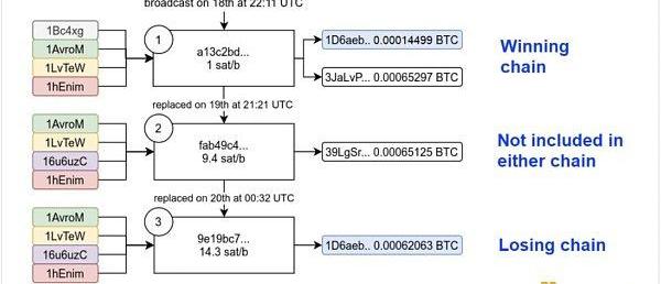 上文提到用戶在交易被確認之前,可以使用費用替代,以替換交易。由于用戶試圖取消先前未確認的交易,并將其發回給自己,因此,增加手續費之后,隨后交易的輸出通常與第一筆不同。能夠肯定的是,這就是Alice替換第二筆和第三筆交易發生的情況。