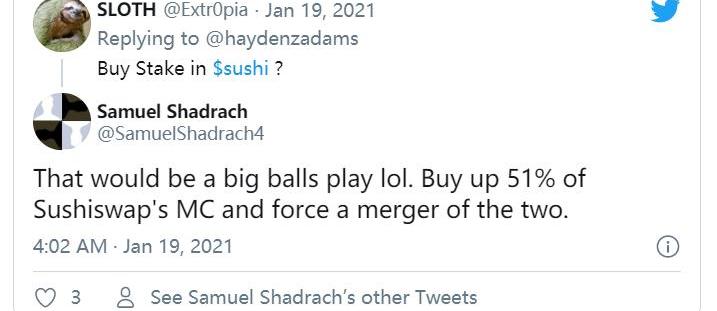 DeFi評論員SamuelShadrach斷言,Uniswap應該收購SushiSwap的大部分供應,迫使兩個平臺合并。