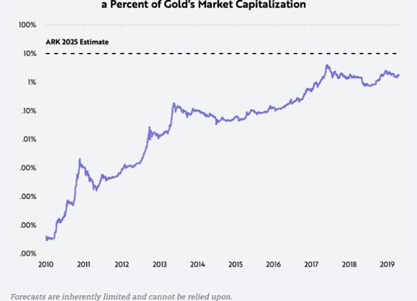 ARK認為,作為首批全球數字貨幣的有力競爭者,比特幣的需求量將至少應與黃金相近。然而,數據證偽了比特幣存在泡沫的假說,如下所示,比特幣的網絡價值才不到黃金的2%。