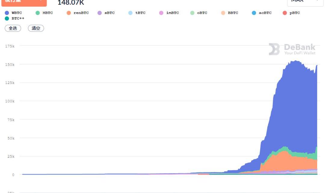 比特幣錨定幣由2019年的1039枚增加至141752枚,上升135倍。比特幣占據加密貨幣市場份額的68%,直到2020年才得以在以太坊鏈上得以大量應用。Compound等流動性挖礦項目使以太坊對資產的需求大大增加,比特幣無疑也是最優質的加密資產之一。3.12之后,MakerDAO增加了WBTC作為DAI的抵押品,以增加自身的穩健性,在市場下跌時有更多的途徑可以作為保證金借DAI。