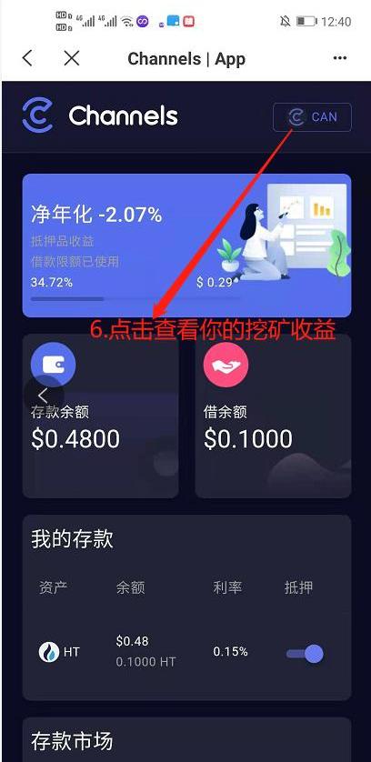按紅色箭頭所指,以HUSDT為例,點擊HUSDT一欄的右側,授權后借出相應代幣即開始挖礦