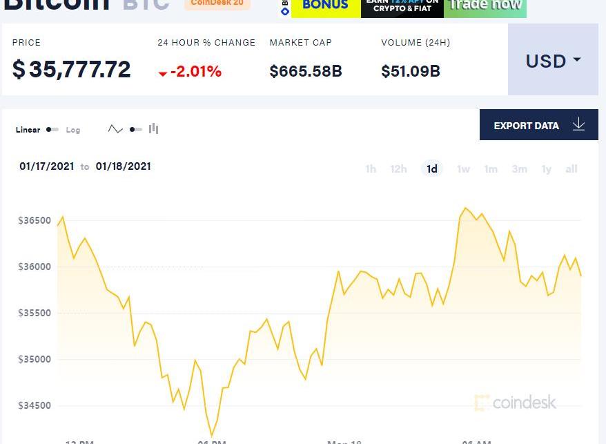 截至目前,比特幣價格跌至3.58萬美元,24小時跌幅達2%。