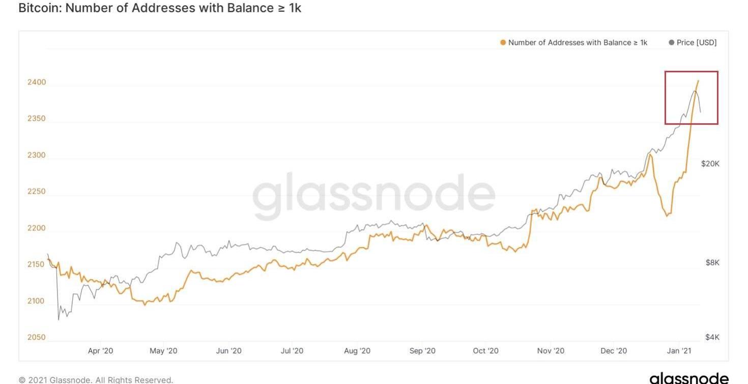 在這場暴跌中,持有1,000BTC的比特幣地址數量仍在繼續上升,并且沒有停止的跡象。這表明投資者并沒有失去信心。自2020年12月以來,持有1000BTC的地址數量已經增長了4%。