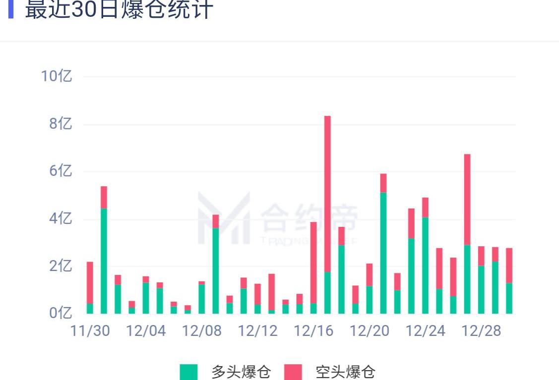 近30日爆倉統計數據中,12月7日爆倉總額最低,總額超過3677.24萬美元,12月17日爆倉總額最高,總額超過8.35億美元。