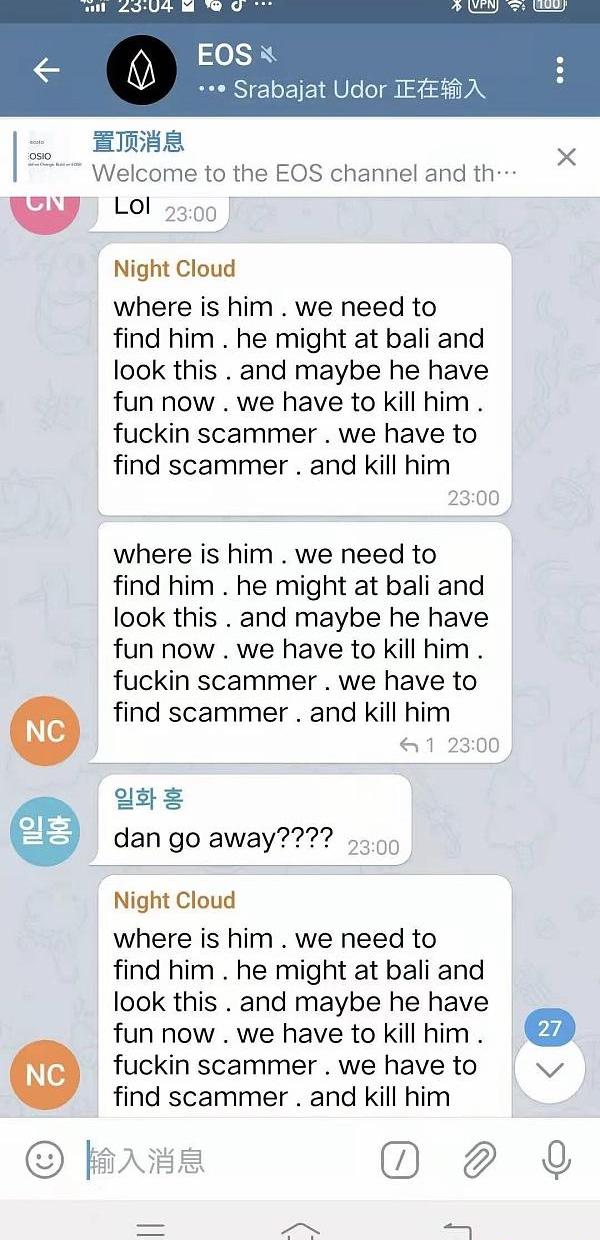 憤怒的投資者開始涌進EOS電報群,用工地英語發出怒吼:“wehavetokillhim.”