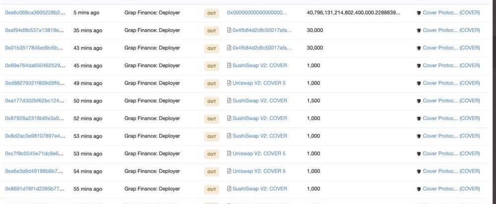 隨后,一個標簽為GrapFinance的地址再次利用了這一漏洞,并增發了大約40,796,131,214,802,600,000Cover代幣,其隨后在SushiSwap和Uniswap這兩個去中心化交易所中成批賣出Cover代幣,這導致DEX上的Cover代幣再次經歷暴跌,最低跌破了10美元。