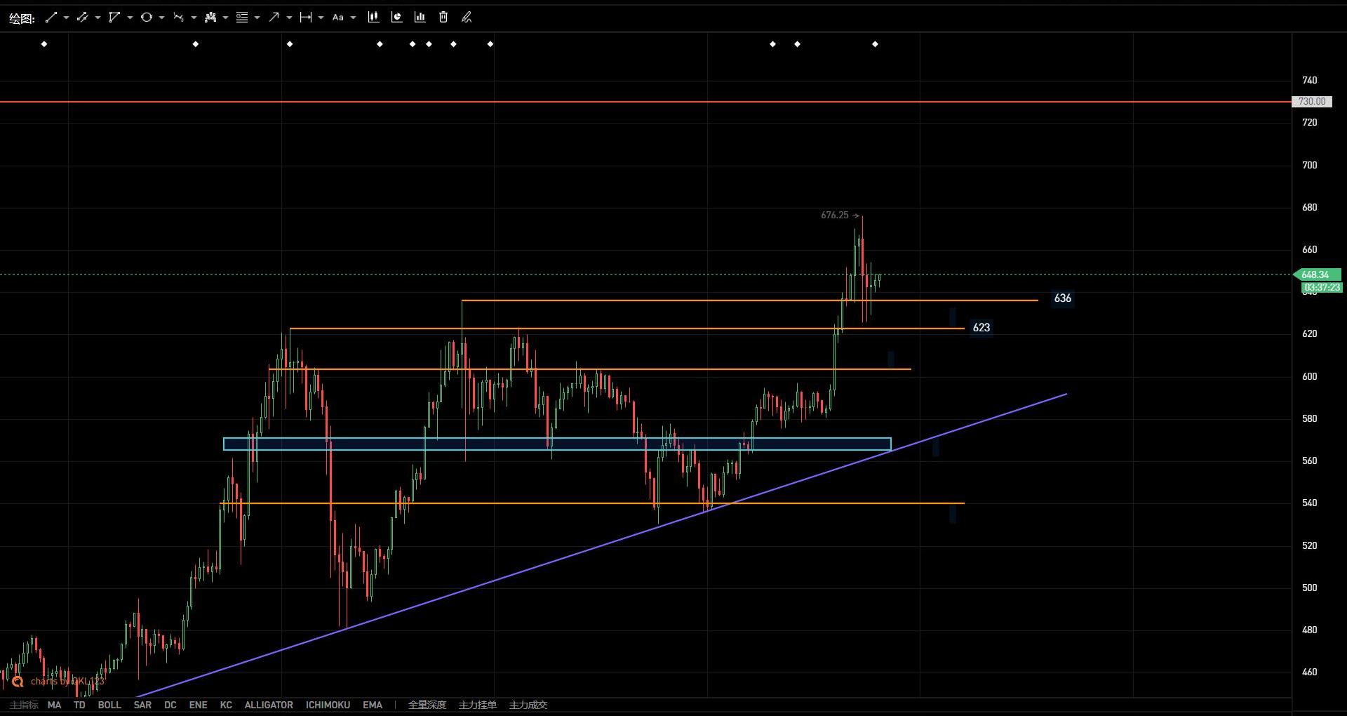 如圖所示,以太坊走勢結構略緩于比特幣,在比特幣創出歷史新高的同時,以太坊并沒有打出短期高點,其年內高點在比特幣新高后下殺的反彈行情中走出,說明場內有大量資金處于流動狀態,比特幣的下殺給主流幣的行情提供了上漲的機會。以太坊上方歷史高點在730附近,下方短期支撐在636一線,重點關注前高623;后續大盤企穩,以太坊還有上漲空間。