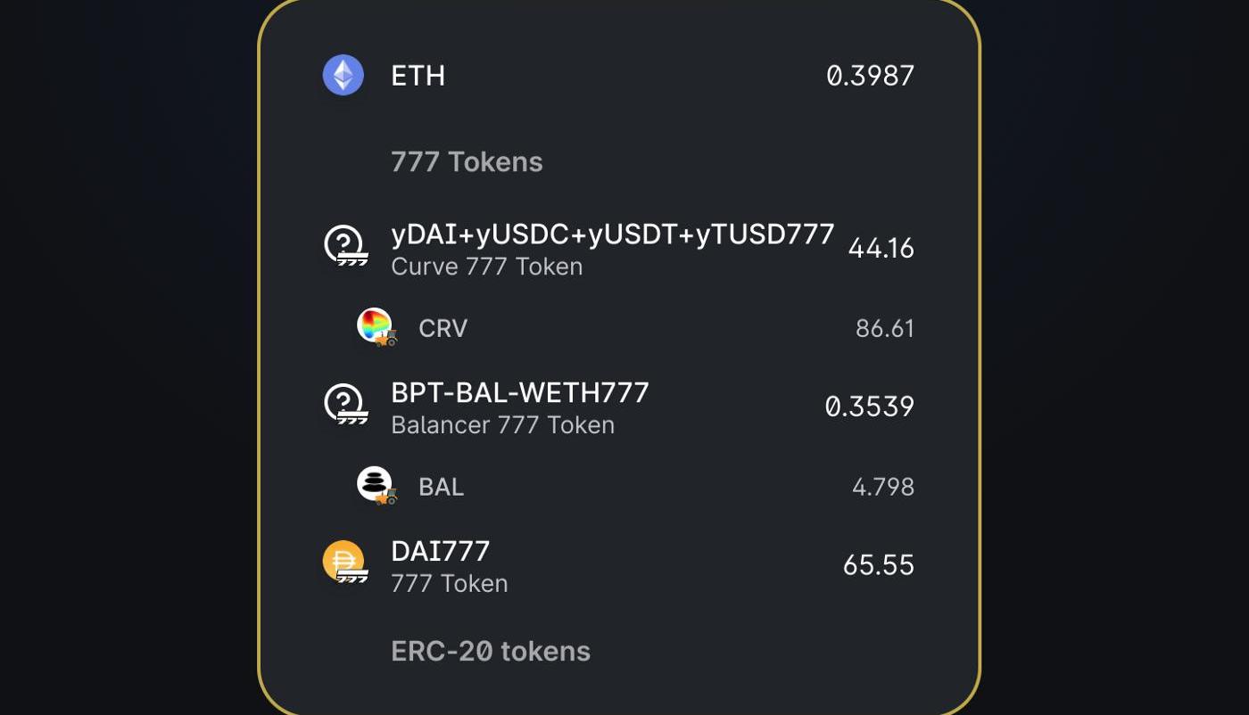 DeFi777最強大的功能在于支持收益農耕。將資金存入到Balancer或Curve池會得到一個特殊的“farmer”代幣,這既代表基礎LP,也代表了任何應計收益。