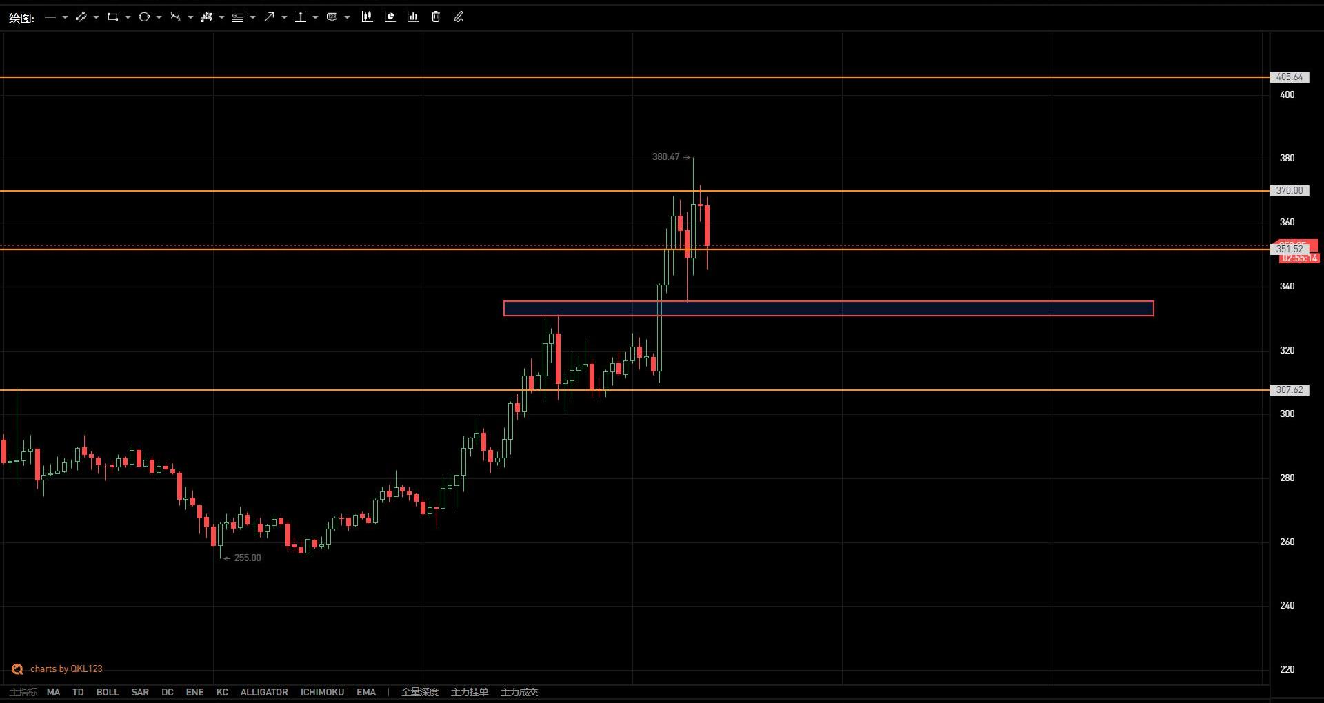 如圖所示,BCH作為這波行情中主流輪動的最后一個項目,可持續效應并不強勁,雖然一度突破前高370附近,但也僅僅是曇花一現,后續走向參考比特幣,下方重點關注330附近支撐力度,中期支撐處于300附近。