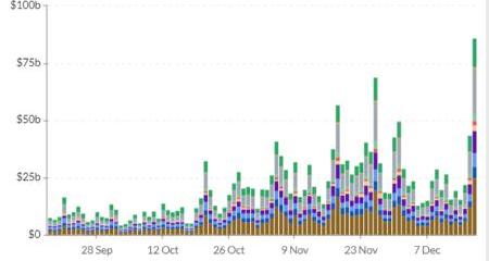 比特幣再創新高,以太坊不溫不火在比特幣到達2萬美元之前,比特幣的價格與交易量一直走勢平淡。至12月16日,比特幣的價格依舊維持在19,000美元左右,而交易量也一直未超過30億美元/天。就在投資者們認為“今年就這樣吧”的時候,比特幣已經悄悄積蓄好了力量。?12月16日開始,比特幣價格開始快速上升,在21點42分突破了20,000美元。市場沸騰了:比特幣日交易量大幅跳升至100億美元,達到30天內最大交易額;而價格也沒有停下,截至發稿前,比特幣價格一度達到23,652美元,并穩定在2萬美元線以上已達40小時。