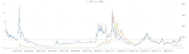 MVRV指標屬于中長期指標,可以理解為,二級市場上短期需求與長期供給的偏離程度。當MVRV<1時,意味著價格被低估,往往對應處于周期低谷;當4<MVRV<5時,意味著價格被嚴重高估。