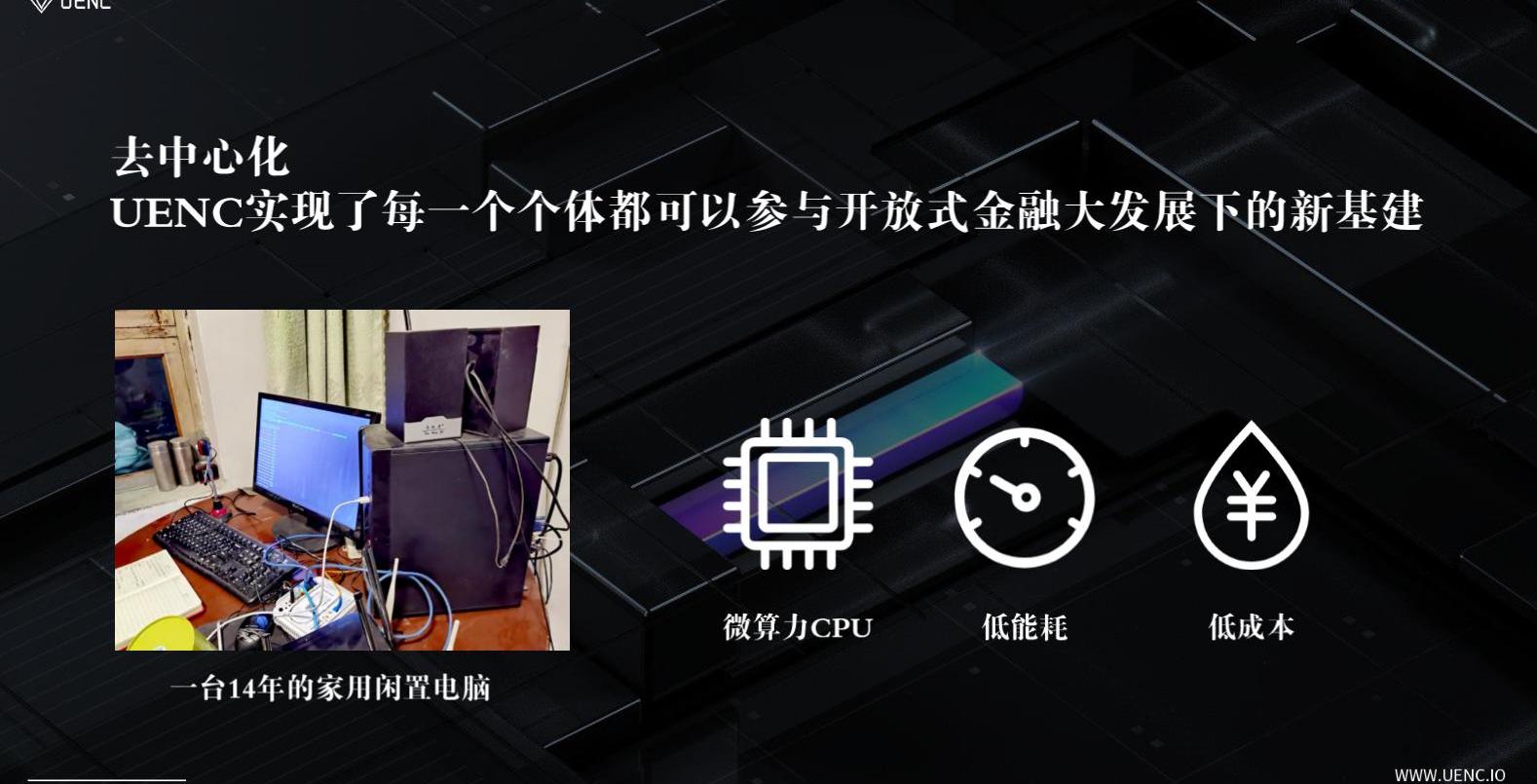 大家可以看一下PPT左側這張圖片,這是一臺2014年的閑置家用電腦,當下的價值預估50元人民幣,啟動并安裝了UENC的客戶端程序,現在已并入了UENC主網,并且已完成了近30筆交易的驗證,10余筆交易的打包。在UENC中新基建的準測是讓更多的微算力設備進入網絡,快速組建一個去中心化,高效,安全的公鏈網絡環境。