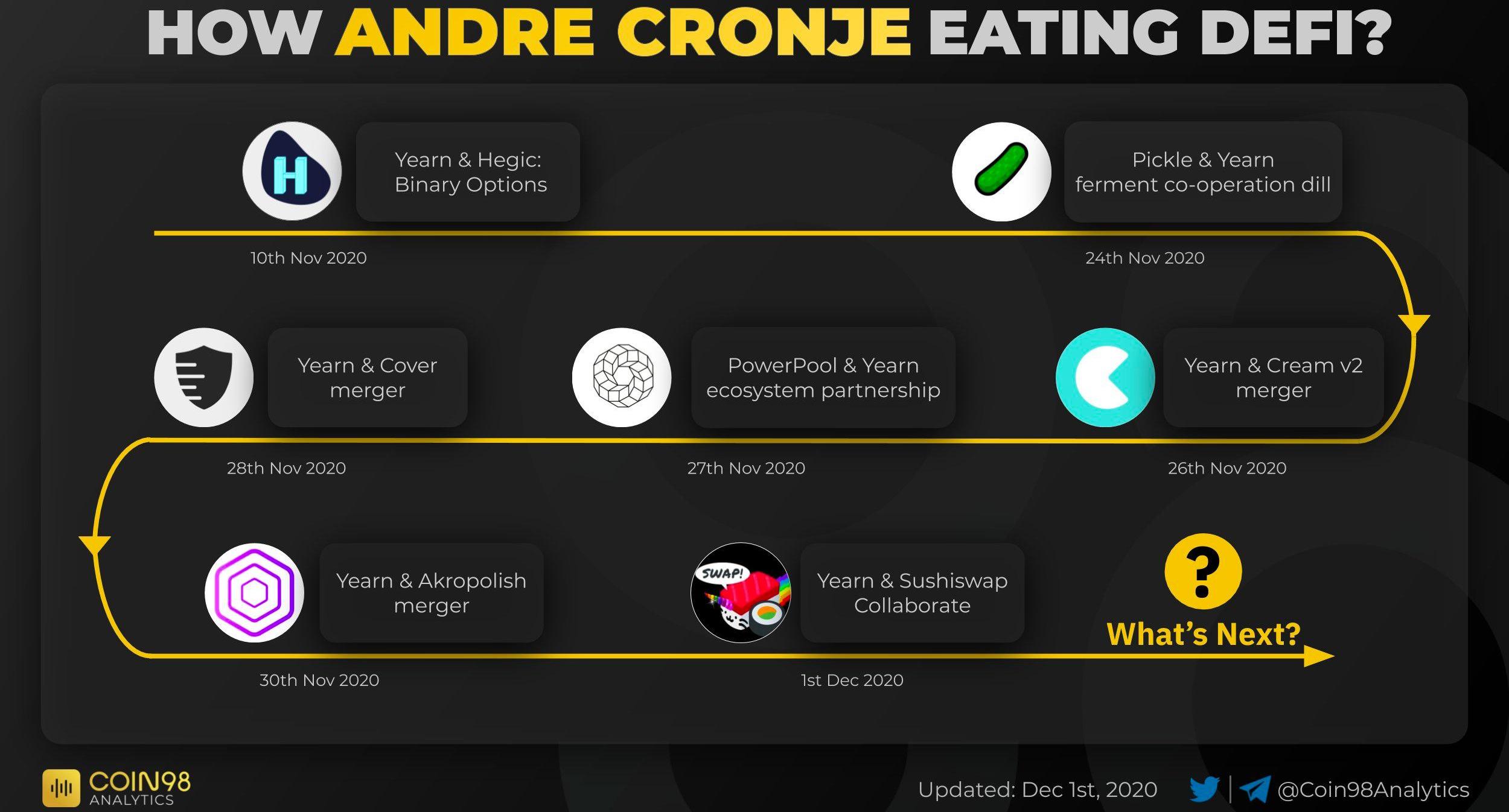 而在同質化競爭加劇的DeFi領域中,YFI上演了DeFi并購大戲。盡管與美團的并購在本質上有所區別,但YFI的擴張氣勢卻可與之媲美。11月24日,AC宣布稱,Pickle和YFI的開發人員已設計出一種結構,可使兩個項目可以共生地協同工作,并計劃進一步集成。僅僅隔了兩天,AC再次宣布,Yearn和Cream開發人員已經合作推出了Creamv2,將專注核心貸款和杠桿產品。當大家還處于震驚之余,Yearn又一口氣與CoverProtocol、Sushiswap進行了合并。閃電式并購下,AC似乎正在建立自己的“DeFi商業帝國”。