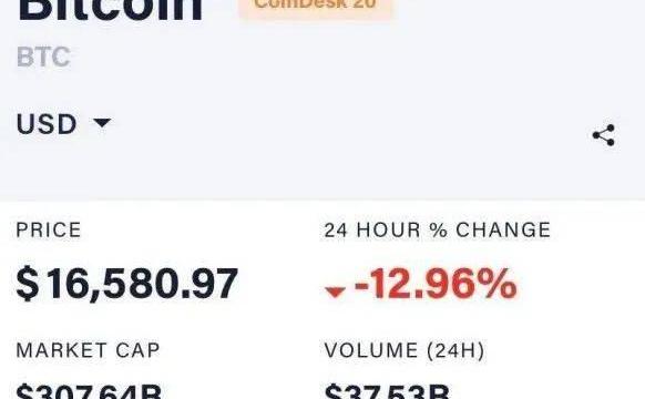 11月26日,比特幣價格高位急跌,盤中跌破17000美元。截至發稿,根據比特幣新聞資源網Coindesk報價顯示,比特幣價格約為16580美元,24小時跌幅達12.96%,24小時內比特幣成交額為375.3億美元。