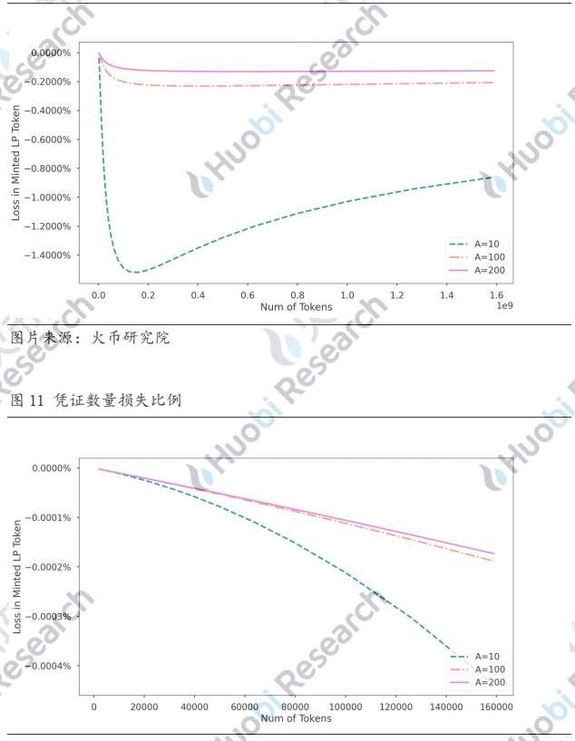 圖中橫坐標x表示沖入的代幣數量相對初始代幣數量的log值,即充幣數量為N_0×〖10〗^x,縱坐標表示LP充入代幣數量與總體代幣數量的比值與新鑄造出的憑證占總體憑證比例的差值。可以看到,如果流動池此前已是平衡狀態,單邊充幣會造成憑證數量的損失,且隨著充幣數量的增加,憑證數量損失在到達極值之后會逐漸縮小,因為在池中占比夠大而逐漸收復了“話語權”。另外,A值變大可以平滑掉一部分的損失,使得到達極值的區間放大。