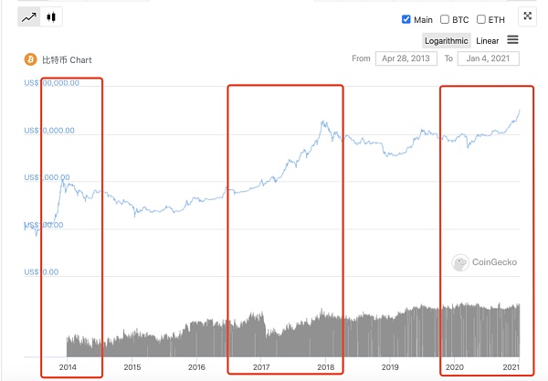 我們先來用這套認知模型復盤下之前比特幣的幾次價格暴漲的路徑: